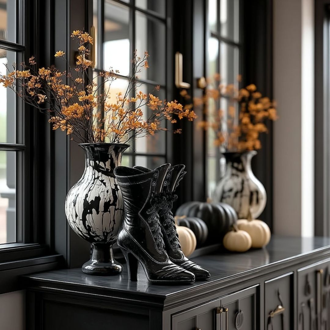 Rather than keeping these boots front and center, create a clever peek-a-boo effect. Try styling them so they appear to be slipping out from under a console table or tucked halfway beneath a stack of books. It adds depth, a wink of surprise, and instantly makes your Halloween décor feel like a carefully curated story.
