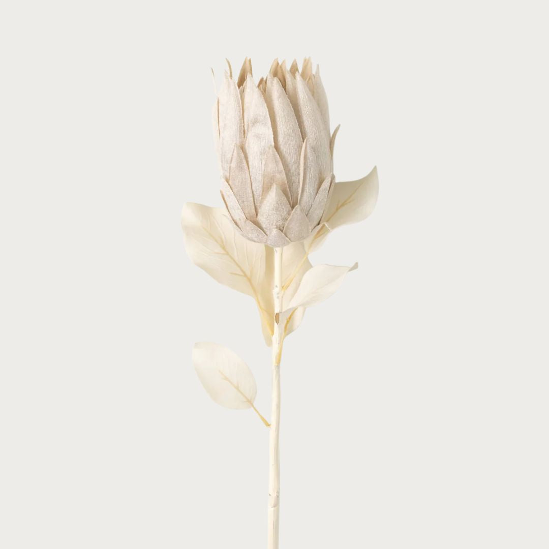 Elevated and sculptural, the Velvet Cream Protea Stem brings an understated touch of luxury to your floral styling. At 29 inches tall, this stem features soft velvet petals in a creamy neutral tone with structured leaves that add both texture and presence. Its bold silhouette makes it a natural statement piece—whether styled alone for a striking minimal look or mixed into an arrangement for added depth.