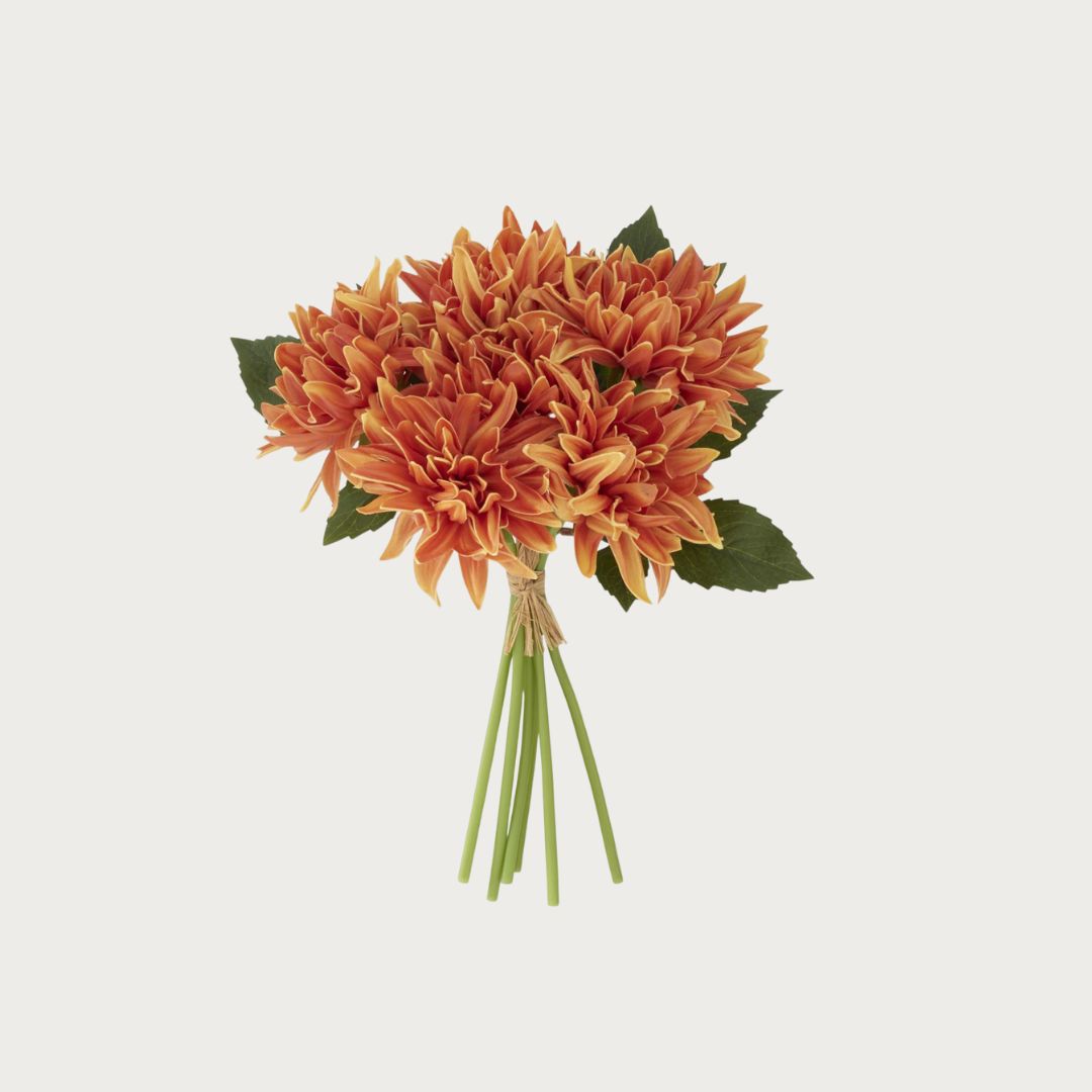 Our 12" Real Touch Rust Dahlia Bundle (6 stems) brings all the richness of fall into one bundle. Each dahlia features velvety petals in warm rust tones, designed with Real Touch technology for a lifelike look and feel that your guests will swear are fresh-cut. Bundled and tied with natural raffia, this stem set makes styling simple—whether you’re tucking them into a vase for a statement piece or mixing them with other fall favorites for a lush arrangement.