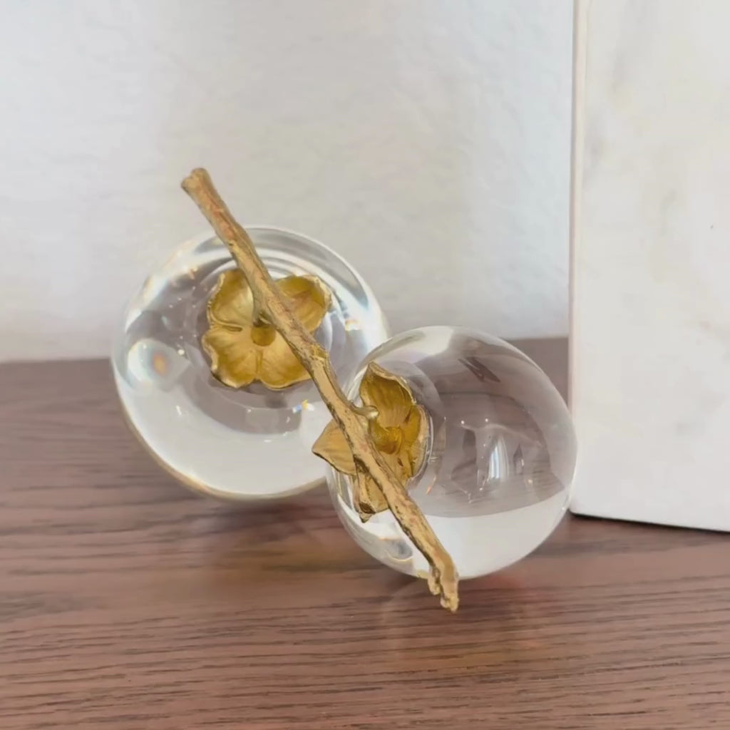 We can’t stop admiring this exquisite pair of crystal pomegranates, elegantly accented with a solid brass twig. Each detail, from the faceted crystal’s luminous clarity to the twig’s golden warmth, is a testament to refined craftsmanship and timeless beauty.