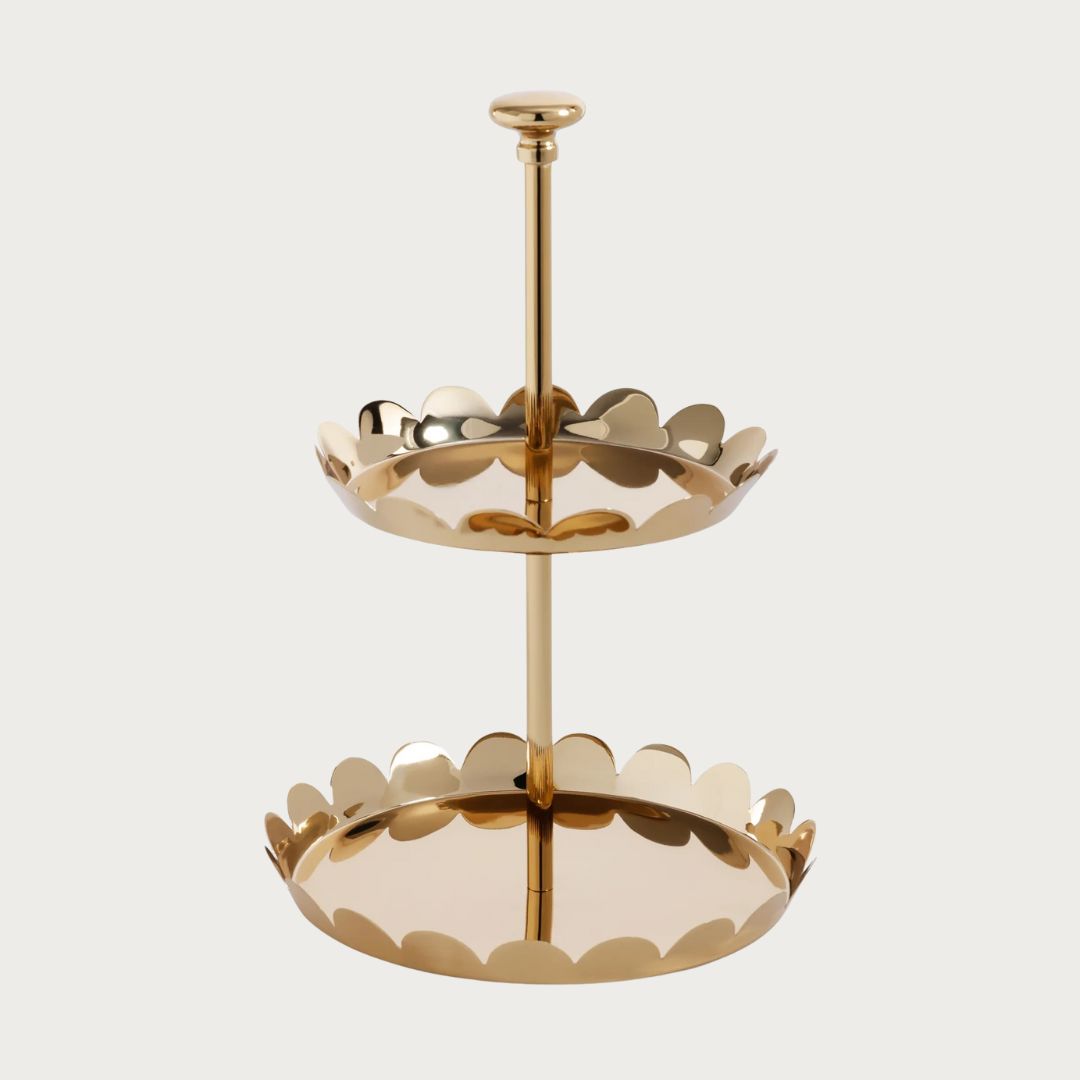Graceful curves meet radiant polish in the Polished Gold Two-Tier Scalloped Stand. Designed to dazzle while keeping an air of refined simplicity, this tiered piece captures the light beautifully with its mirrored finish and scalloped edges reminiscent of delicate petals.