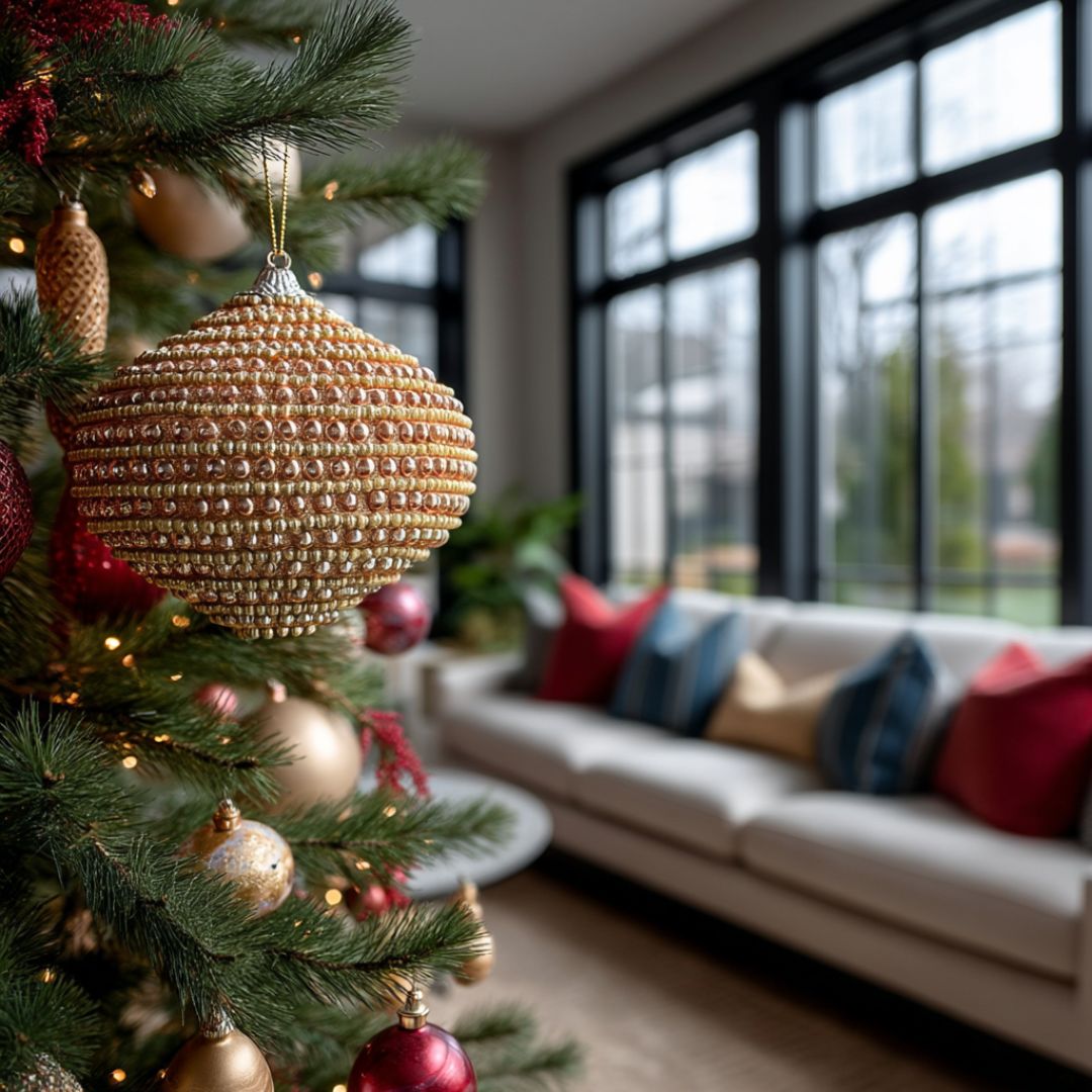 “These gold beaded ornaments have that perfect balance of glam and grace. I love using the teardrop shapes near the bottom of the tree and the round ones closer to the top — it creates such an elegant, balanced flow.”