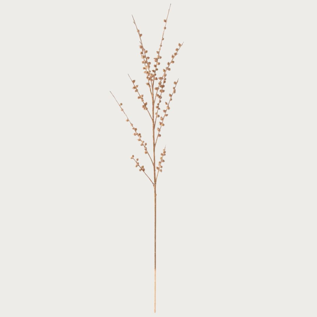 Elegant, dimensional, and endlessly versatile — the 47-inch Gold Beaded Berry Stem brings a soft shimmer and refined texture to any arrangement. Each slender branch is adorned with delicate beaded berries that catch the light beautifully, adding a subtle golden glow that feels both festive and sophisticated.