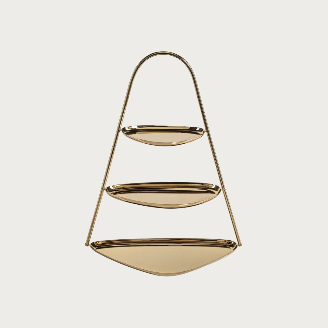 Sculptural and sophisticated, this Three-Tiered Gold Stand adds a radiant touch of modern elegance to any setting. Its gleaming gold finish and graceful arched frame create a striking presentation—whether styled with confections for an intimate gathering, adorned with candles and ornaments for the holidays, or layered with treasured décor pieces year-round. Each mirrored tier beautifully reflects light, infusing warmth and quiet glamour into your space.
