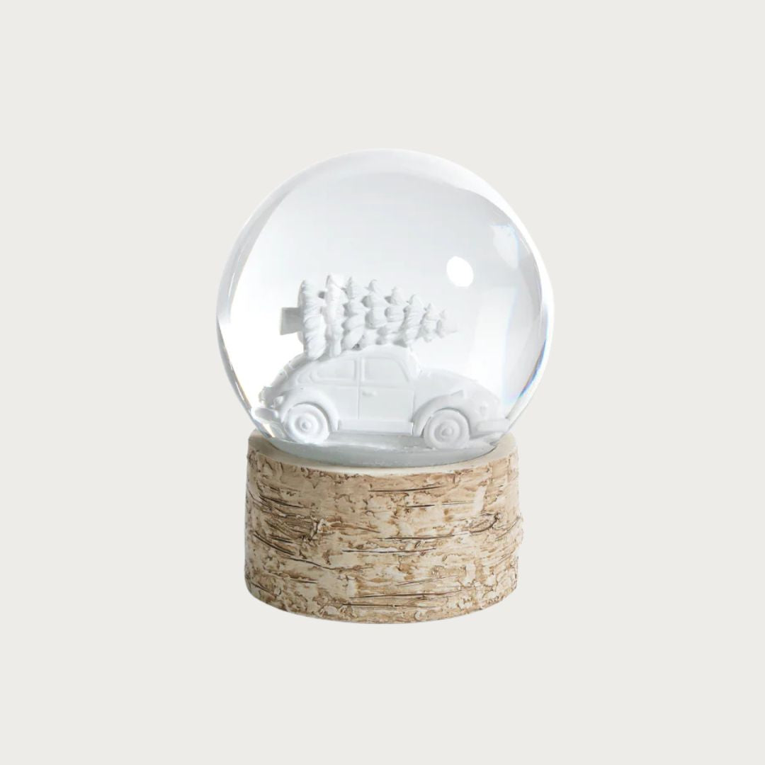 A modern nod to holiday nostalgia. This Snow Globe with Tree on Car captures that timeless winter moment — the tree’s been picked, the car’s packed, and the season’s magic is officially underway. Encased in crystal-clear glass and perched atop a natural birchwood-inspired base, its minimalist all-white design feels fresh and quietly sophisticated. A simple, charming reminder that joy is often found in the little things (and the little cars).