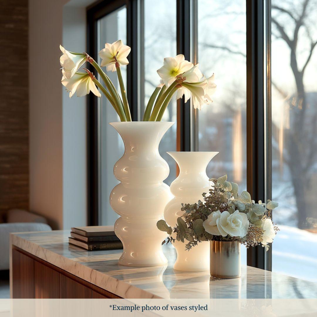 - 1 - "12 High Glossy White Fluid Ribbed Vase. 12" high x 5.25 " wide. This is the partner to the tall vase. Style them together or play them in different areas of the same room. Or, Place one in one room and the second in anotherl You can't go wrong either way!