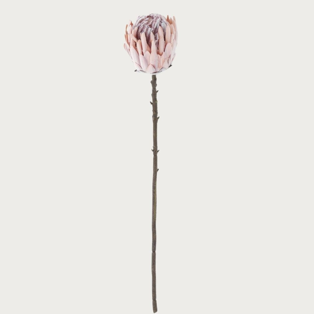 This flocked pink king protea stem is all about sculptural impact with a softened, romantic edge. The generously sized bloom features layered petals finished in a velvety flocked texture, giving it depth, warmth, and a quietly luxurious feel. Set atop a natural-looking stem, it strikes the perfect balance between bold and refined — the kind of floral accent that instantly elevates a space without trying too hard.